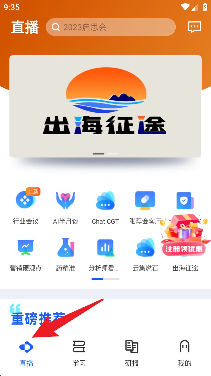 1. 在首页底部点击直播图标,即可进入直播模块,可浏览热门会议、专题活动与实时视频内容。