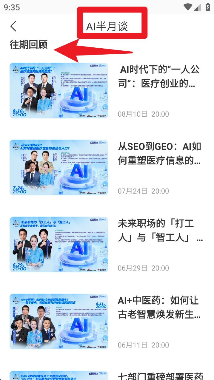 2. 点击直播首页中的半月谈入口,会跳转进入往期回顾页面,可按时间查看历史直播内容。