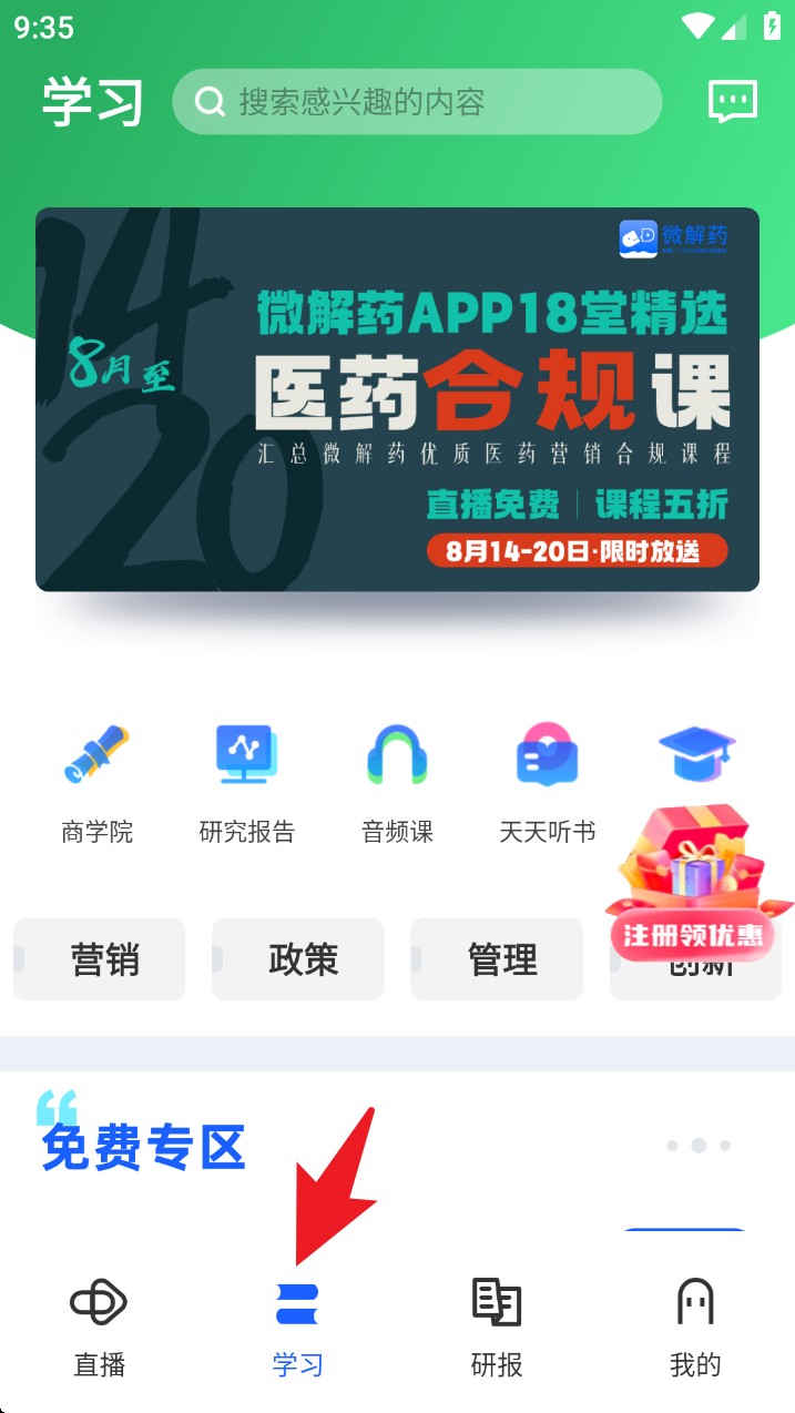 3. 在底部导航栏点击学习,进入学习专区,可访问商学院、研究报告、音频课等多种学习资源。