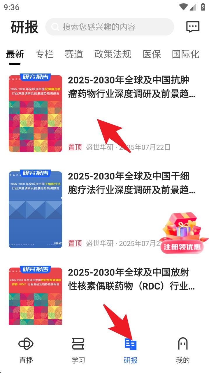 4. 点击下方的研报图标,系统会展示各类专业行业研报内容,可按标签分类浏览,支持查看全文详情。