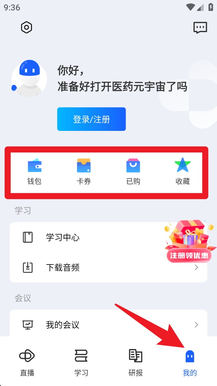 5. 点击底部的我的按钮,进入个人中心,可查看钱包、卡券、已购内容与收藏记录,也能进行登录注册操作。