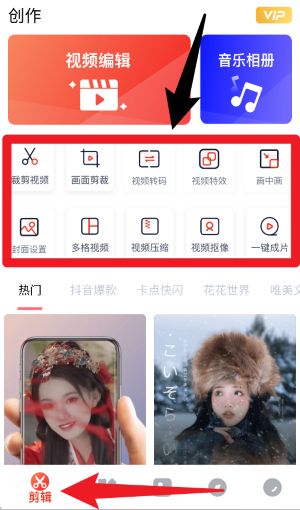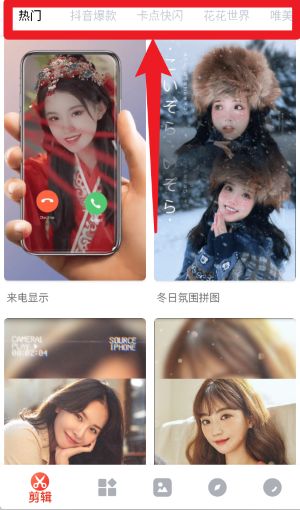 2、继续下滑页面,在上方在热门、卡点快闪、花花世界等栏目中,可选择对应模板快速制作热门视频。