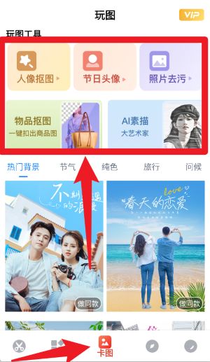 4、在卡图栏目可进行人像抠图、节日头像、照片去污、物品抠图及AI素描等操作,便于制作创意图片。