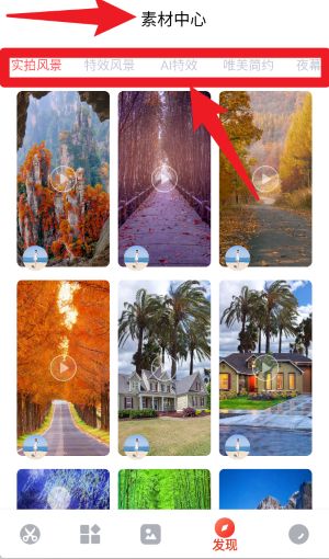 5、进入素材中心可在实拍风景、特效风景、AI特效等分类中下载所需素材,丰富视频背景与画面效果。