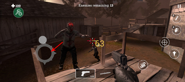 4、滑动左下角的摇杆进行移动进行移动,当面临许多僵尸的时候,我们利用障碍来逐个击破僵尸;