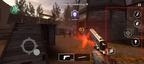 5、右边的按键从上到下分别是加血量、手雷、瞄准、跳跃、换弹按钮;