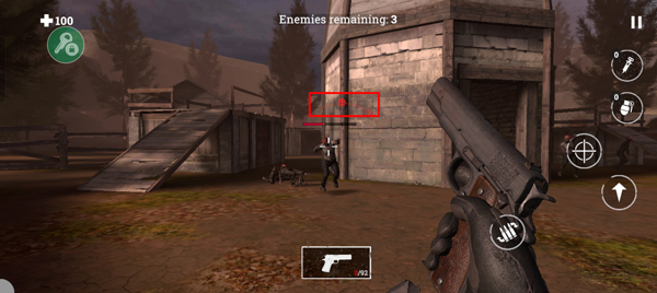 7、当我们还没通关,但是地图上已经看不到僵尸的时候,屏幕中间会有红色提示,根据红色提示可以知道僵尸的方位,将所有僵尸击杀之后通过关卡。