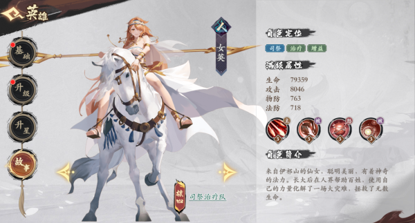 小结:女英作为新手期间首充6元就送的英雄,自身兼顾奶人和增伤双位一体的英雄这无疑是必练的,前期到中期这一段时间有这样一位英雄可以更好的开荒,培养时可以优先提升星级和攻击力,这样可以方便给全队增伤以及奶量提升。