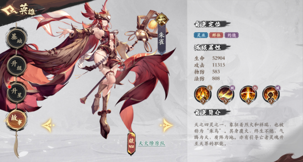角色背景:天之四灵之一,象征着烈火和祥瑞,也被称为“朱鸟”。其身覆火,终生不熄,气腾为天,质阵为地。亦有引导亡者灵魂升至天界的职能。