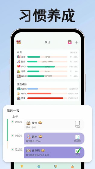 1、每日打卡机制:可自定义多个日常习惯,完成即打卡,连续记录形成可视化成长轨迹。
