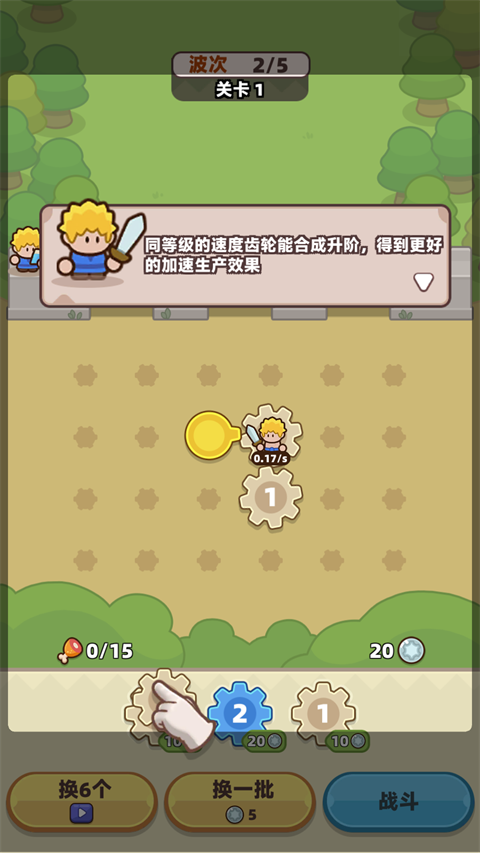 3、自动战斗机制:点击“战斗”后,齿轮自动旋转召唤士兵,士兵会自主攻击敌人,无需手动操控,主打策略前置。