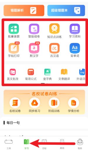 3、在学习页面中,用户可选择智能组卷、知识点训练、字帖打印等学习工具,满足多样化学习需求。