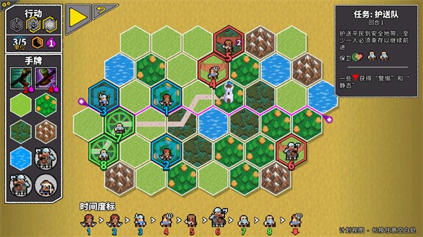 5、当你放置卡牌后点击左上方的黄色三角符号,然后棋盘上的棋子就会按照下方的时间度标顺序自主行动。