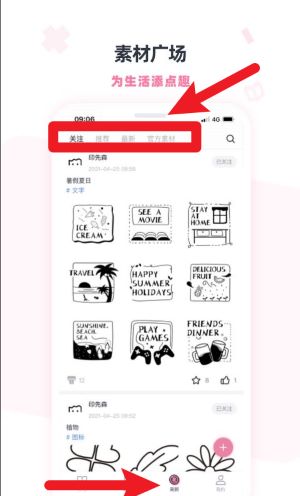 3、进入素材广场功能页后,可浏览并选择关注、推荐、最新或官方素材,点击喜欢的图案即可进行打印编辑。