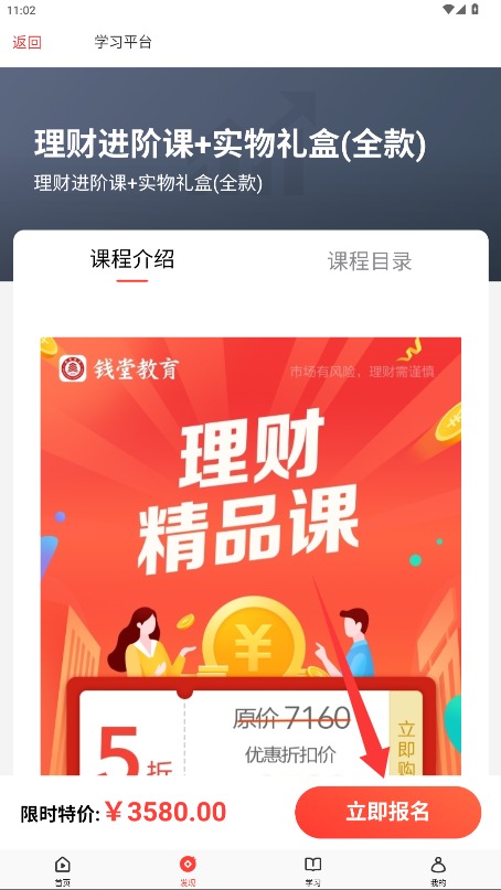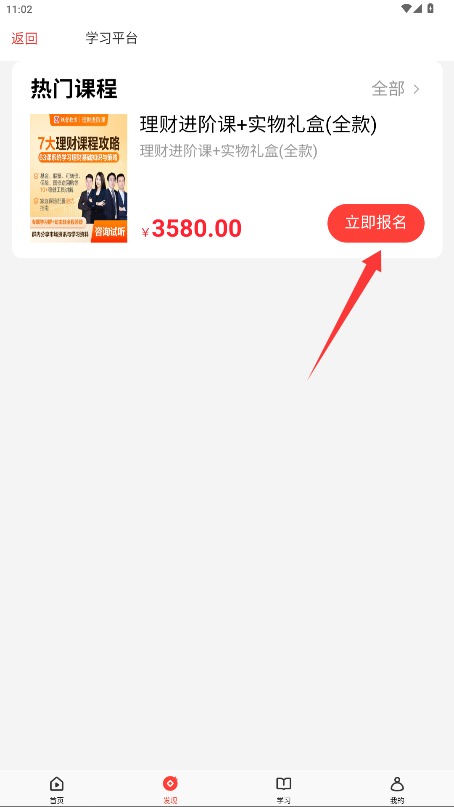 3、进入发现功能页面浏览热门课程推荐,点击立即报名按钮开始选课操作流程。