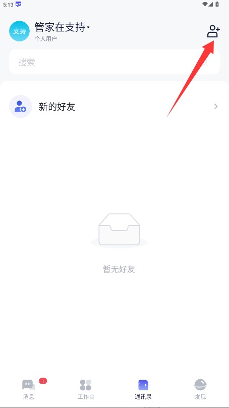 3、进入通讯录功能主页面,点击右上角添加好友功能按钮开始新建联系人信息。