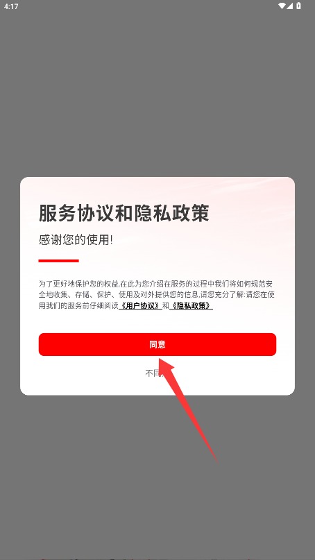 1、初次使用需阅读平台服务条款与隐私政策,确认后点击同意按钮进入应用。