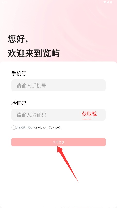 2、在登录页面输入手机号和验证码,勾选同意相关条款后点击立即登录进入应用。