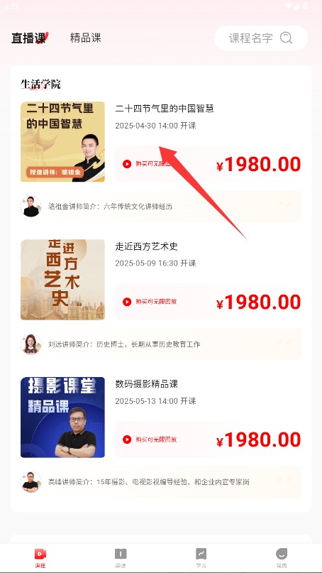 3、进入课程中心可浏览推荐的直播课程,或通过搜索栏查找特定学习内容。