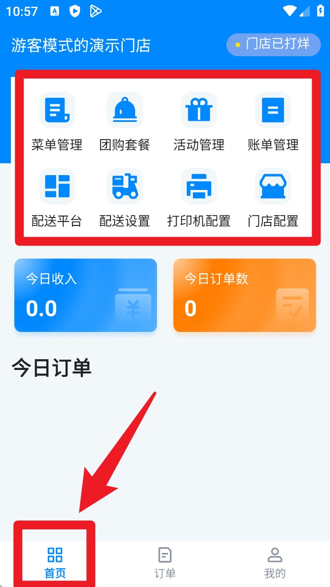 2. 注册成功后会跳转至首页,点击底部首页可查看菜单管理、订单管理、门店配置等核心功能模块。
