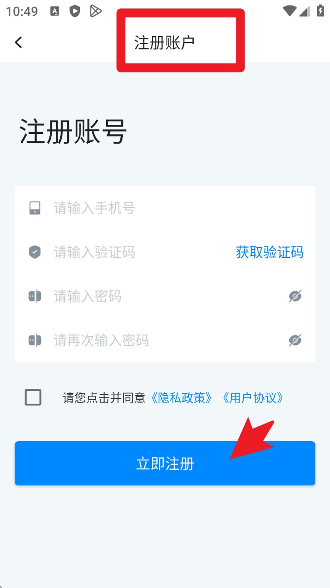 1. 进入App后点击注册账户,填写验证码与密码,并勾选同意协议,完成后点击立即注册即可完成新用户注册。