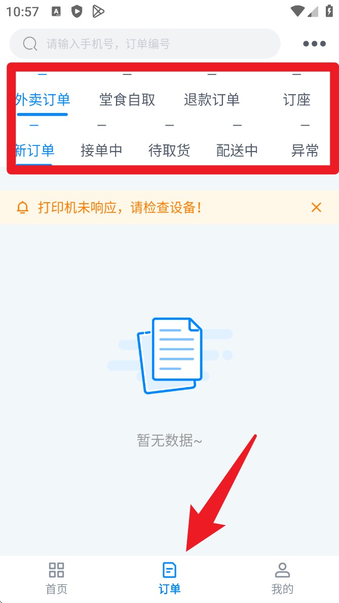 3. 切换到底部订单页面,可按订单类型查看当前外卖、自取、退款等分类,并查看每笔订单的状态。