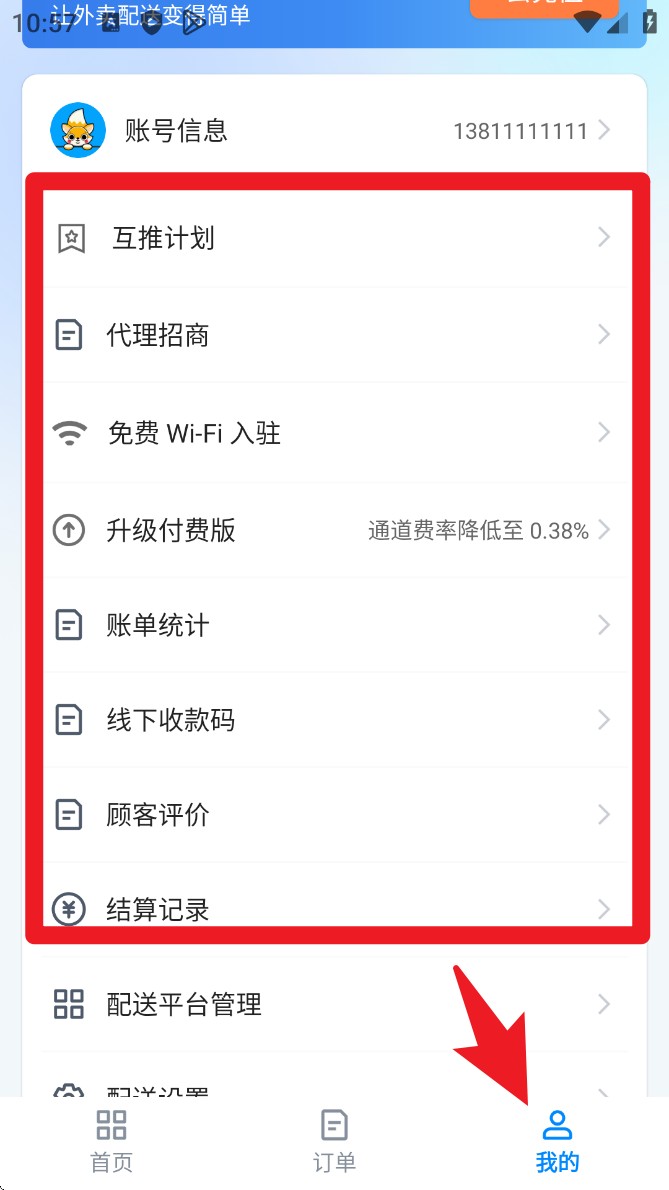 4. 点击底部我的页面可进入账号信息区,查看账单统计、顾客评价、结算记录及升级服务等多项功能。