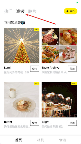 1、在首页点击上方的“滤镜”,选择一款滤镜点击“使用”