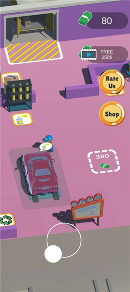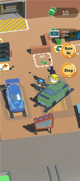 1、场景细节:划分出修理车间、停车场、洗车区等清晰区域。缺轮、冒烟、车身凹陷等故障车辆采用卡通夸张画风呈现,大幅提升游玩的趣味性。