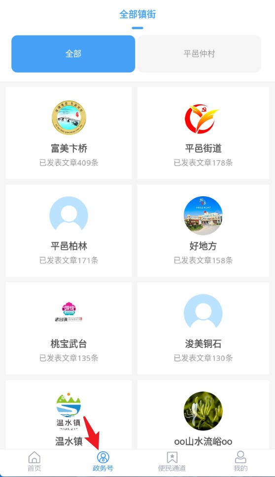 2.点击底部政务号,浏览政府部门发布的官方通知和公告。