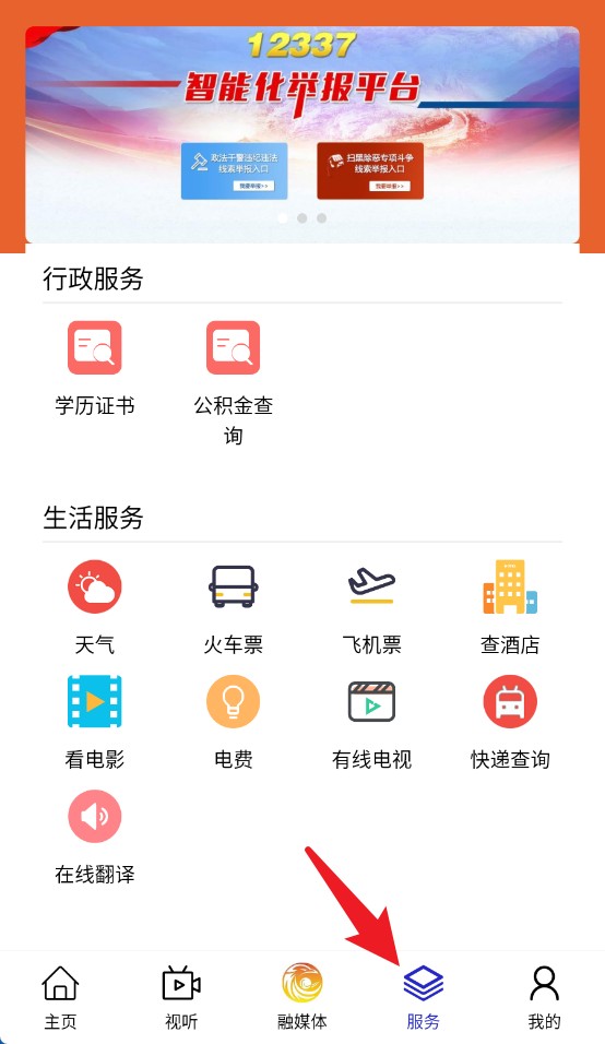 4、服务页面整合政务与生活服务入口,提供查天气、购票、电费查询等便民功能。