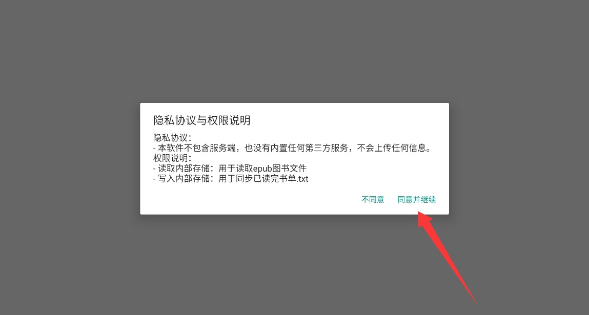 1、打开app之后,先看看隐私协议和权限说明,点同意并继续才能用。