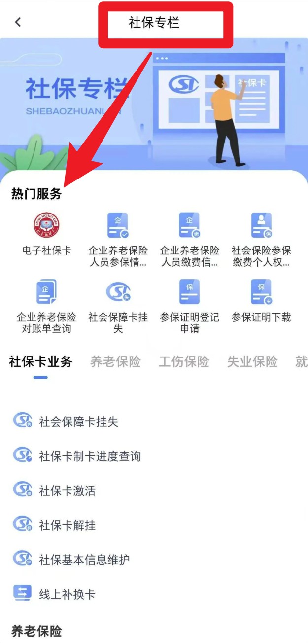 1. 打开App进入首页,点击上方社保图标进入社保专区,可查看电子社保卡、参保证明、卡挂失等服务。