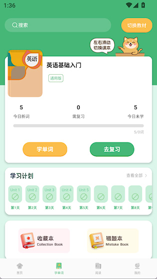 1、进入学单词进行学习和复习,有收藏本和错题本辅助