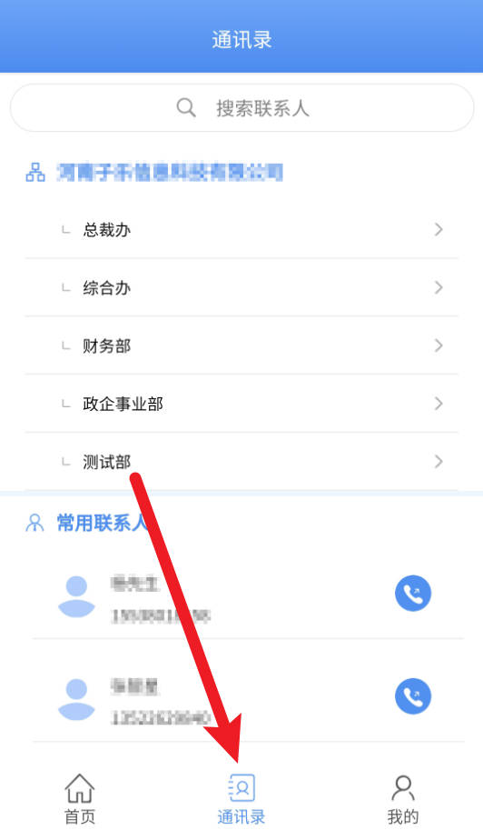 2、点击底部通讯录按钮,查看和搜索公司通讯录。