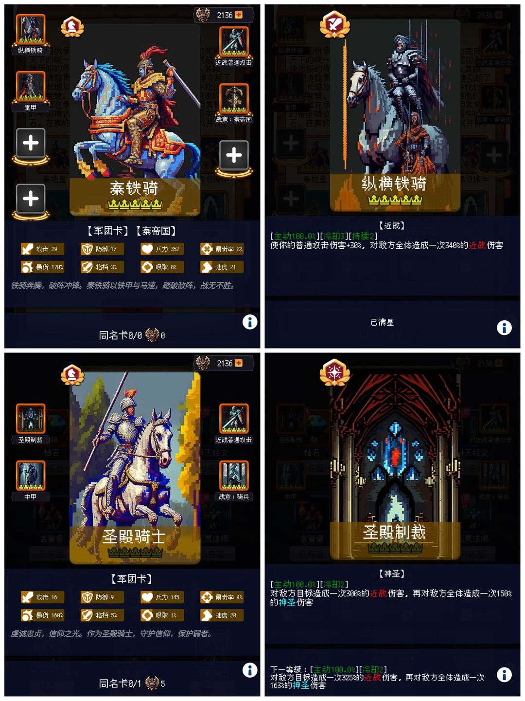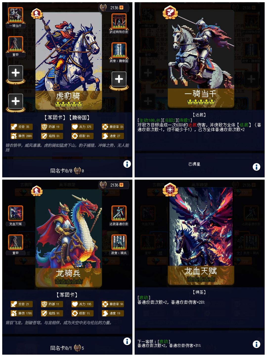个人评价:打重甲很好用,因为是神圣伤害,但是对全体的杀伤力不如秦骑。零氪微氪党玩家首选骑兵阵容之一。