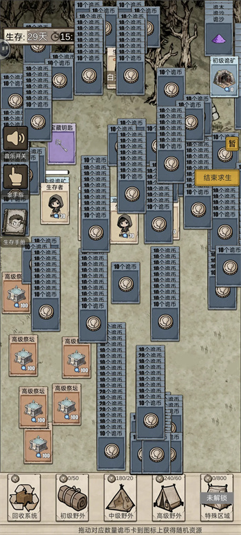 2、资源与探索策略:优先升级诡矿至中级以高效获取诡币;用诡币在对应等级野外区域随机获取资源,每个区域必得对应等级祭坛,100%成功收容诡异。