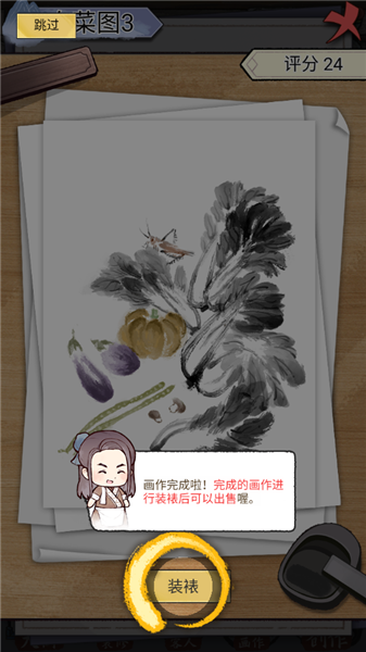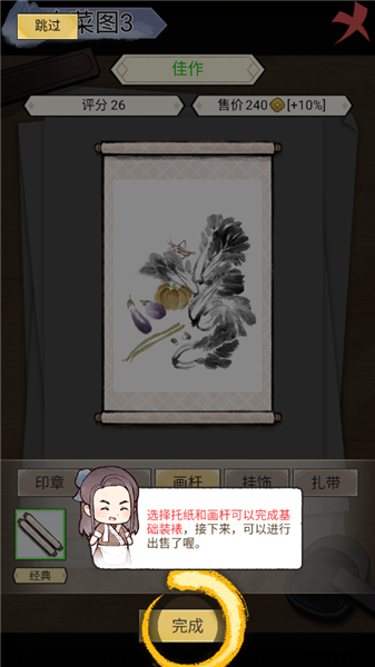 3、画作完成后,需要进行装裱,依次选择托纸、画杆、印章等后,点击完成。
