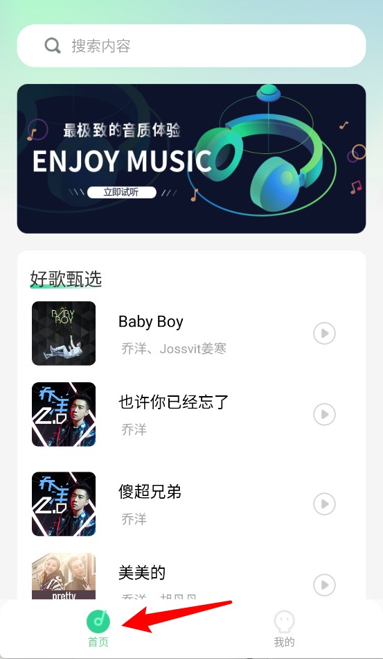 1、首页展示精选歌曲和搜索栏,你可以在这里搜索喜欢的音乐并开始试听或收藏。
