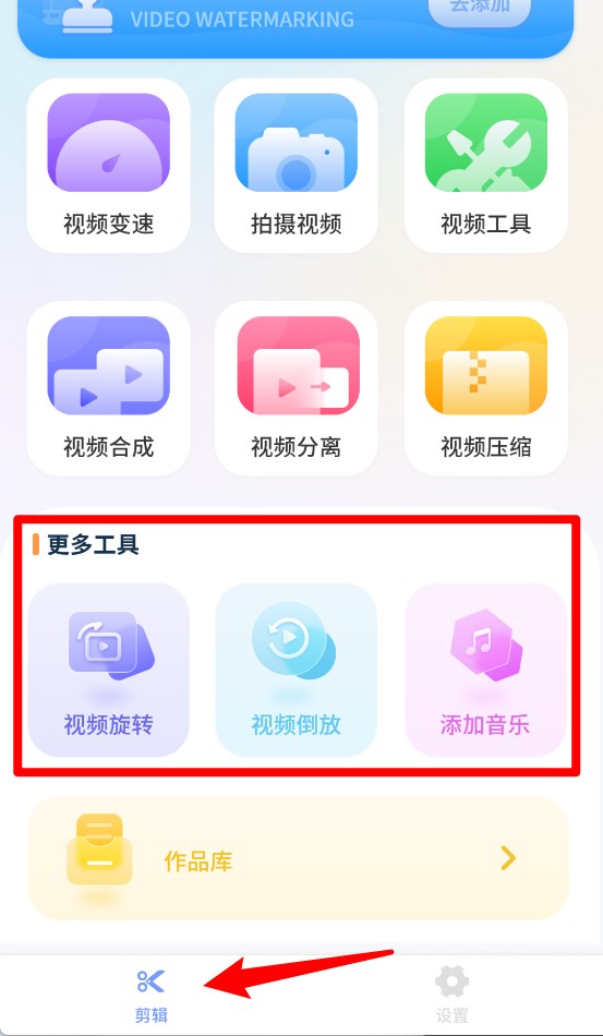 2、在主界面点击更多工具,可展开视频旋转、倒放、添加音乐等额外编辑功能模块供用户选择。