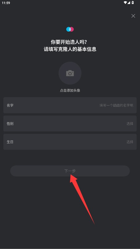 4、按要求上传头像照片,填写克隆人姓名、性别等必要信息,完成填写后点击下一步。