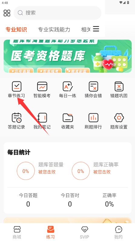 2、进入练习中心选择章节练习功能,系统将展示分类整理的专业医学题库。