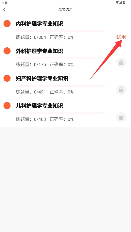 3、根据个人备考复习需求选择特定知识点范围,点击试用按钮进入刷题练习。