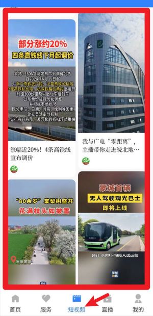 2、点击短视频,页面聚合了高铁涨价、本地建设与无人驾驶巴士等热门资讯,方便用户快速了解蒙城动态。