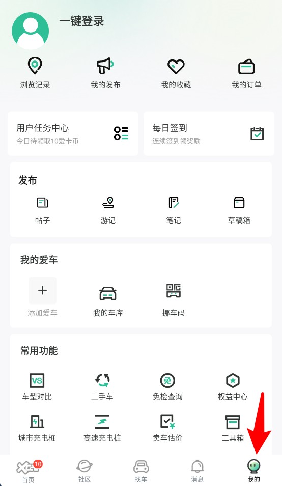 1、点击首页右下角我的按钮可进入个人中心,查看收藏、订单、任务及爱车管理等功能。