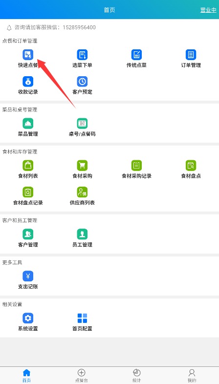 1、启动app之后,在首页界面找到左上角的快速点餐功能按钮,点击即可进入点餐流程。