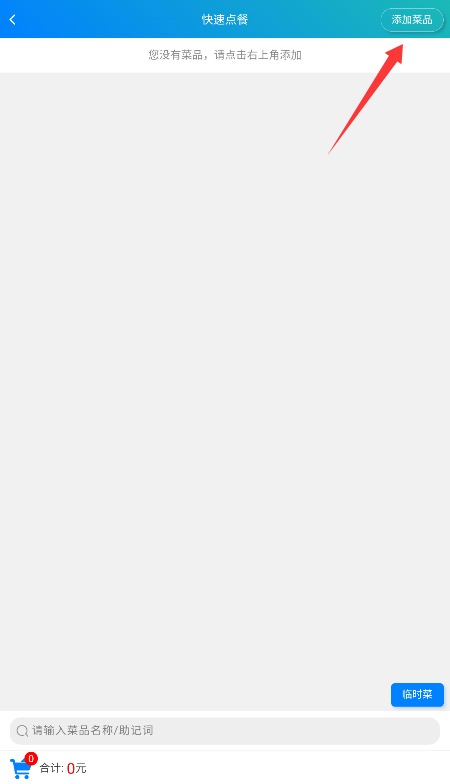 2、进入点餐页面后,选择右上角的添加菜品选项,系统将跳转至新菜品信息录入界面。