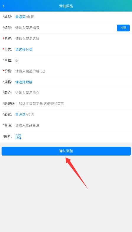 3、按要求填写菜品名称、分类及价格等详细信息,确认无误后点击底部确认按钮完成添加操作。