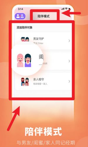 4、进入陪伴模式,选择添加陪伴对象,可选择男友、闺蜜或家人共同记录周期,增进彼此理解与支持。
