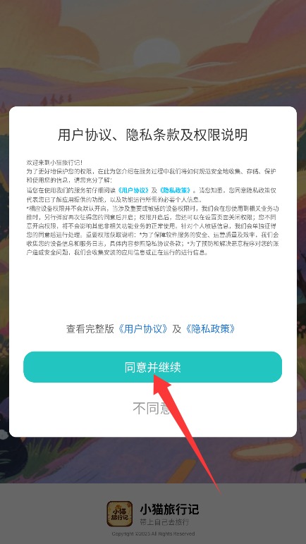 1、初次使用需阅读用户服务协议与隐私政策,确认后点击同意并继续选项进入应用。